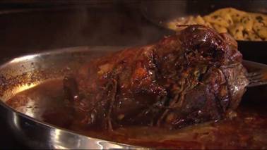 Faire cuire le jambonneau jusqu’à ce que la viande se détache de l’os.